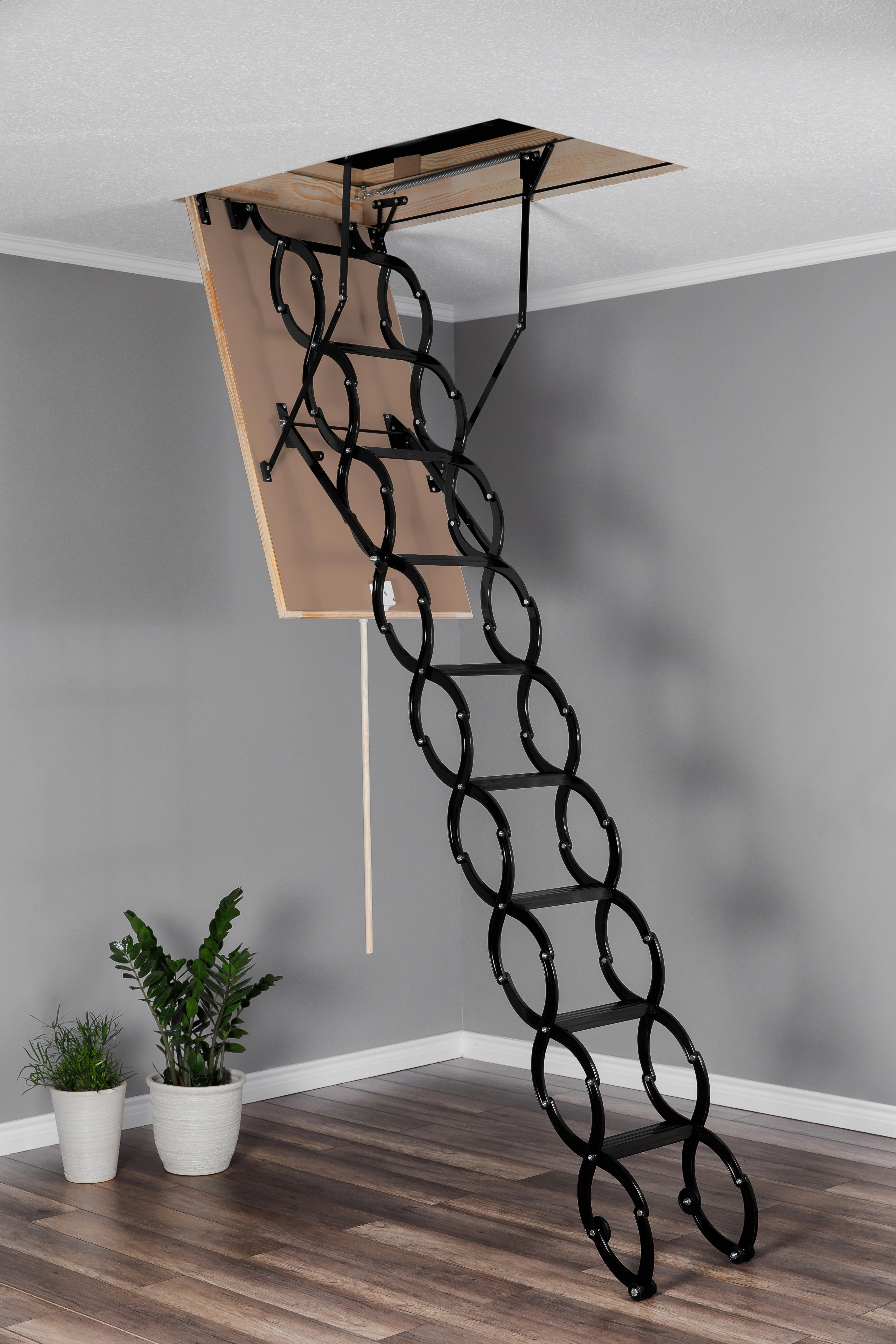 Лестница чердачная раздвижная ножничного типа, работает по принципу сжатия. Термоизоляционная крышка типа“сэндвич “, толщиной 26мм, утеплена пенопластом , облицована с двух сторон ДВП древесного цвета. Лестница предназначена для условий, когда чердак утеплен и не требует дополнительной теплоизоляции. Короб деревянный высотой 140мм. по периметру проходит уплотнитель.