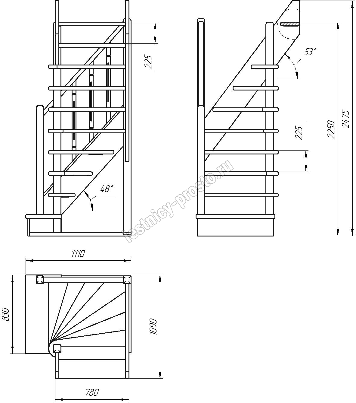 Деревянная межэтажная лестница ЛЕС-91 2250-2475 проем 1090-780, Сосна
