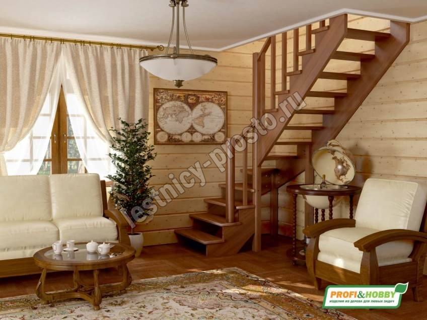 Ступени и поручень лестницы изготовлены из ясеня, остальные элементы из сосны.