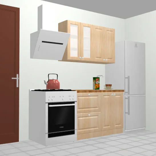 Компактный кухонный гарнитур из 100% массива сосны шириной 1,2 и высотой 2,14 метра (верхние шкафы высотой 72 см). Подойдёт для небольшой кухни, квартиры-студии или загородного дома.