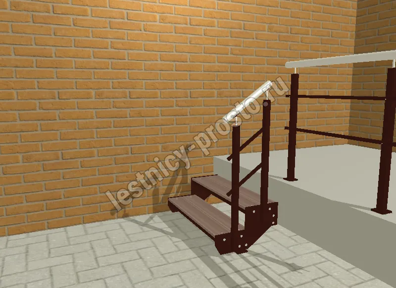 Ступени лестницы состоят из металлической рамки, обеспечивающей необходимую прочность, и покрытия из террасной доски ДПК (древесно-полимерный композит). Ступени не боятся воды и мороза, не теряют со временем свой внешний вид и не требуют ухода.