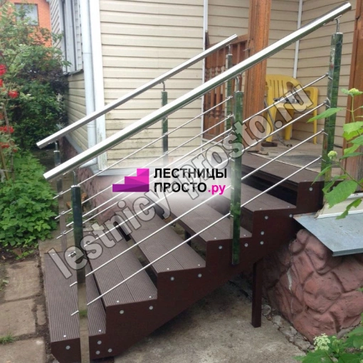 Ограждение типовой лестницы крашеное или из полированной нержавеющей стали. Базовый материал ступеней: террасная доска