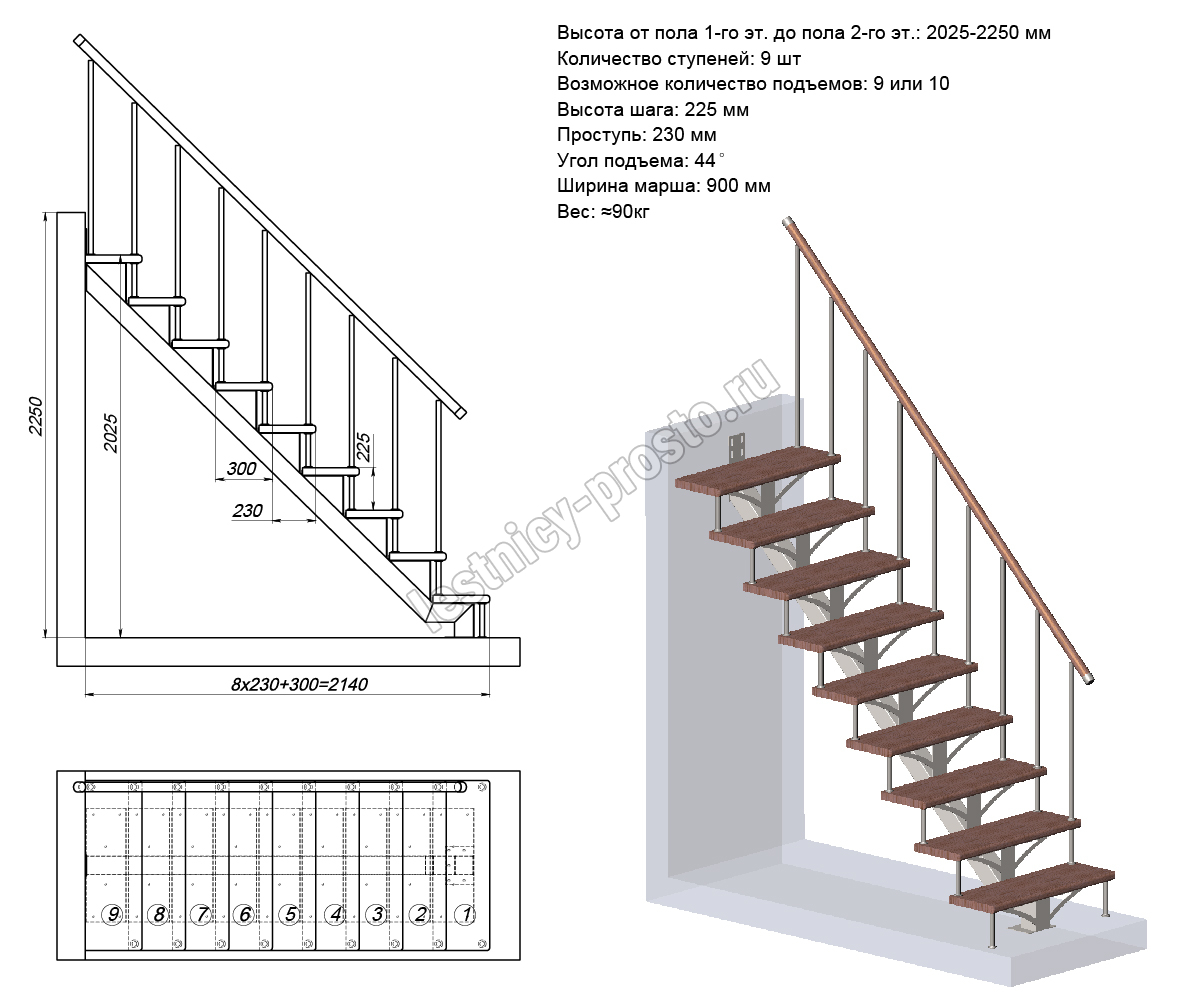 Лестница PROSTO MONO прямая, h225 см, ступени бук