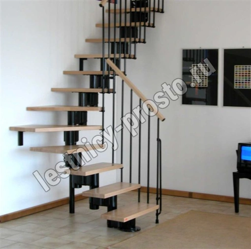 Красивая комфортная лестница с уникальной модульной конструкцией, которая позволяет собрать большое число модификаций, подходящих под ваш проём и другие условия помещения. Возможные варианты сборки лестницы смотрите в блоке "чертежи и схемы". При монтаже модульной лестницы KOMPACT, вы можете варьировать высоту шага и проступь, получив точную необходимую высоту и габариты. Ступени выполнены из массива бука и покрыты качественным износостойким лаком. Базовая комплектация позволяет получить лестницу под высоты этажа в диапазоне 2250 - 3030 мм, кроме того, установив дополнительный комплект увеличения высоты, можно поднять высоту лестницы до 3730 мм. Каркас и стойки ограждения выполнены из пластифицированного металла.