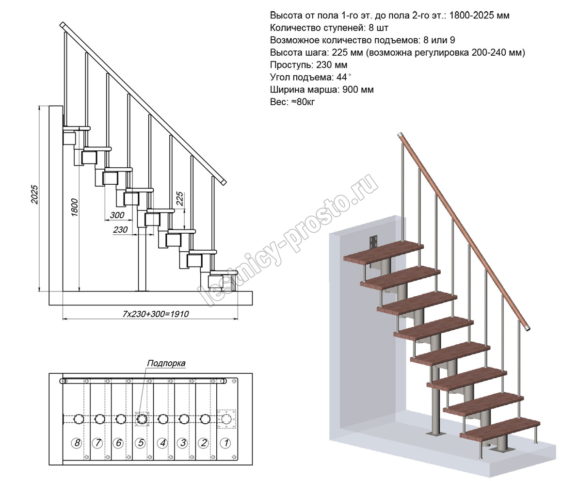 Высота лестницы 1800 - 2025 (8 ступеней) мм