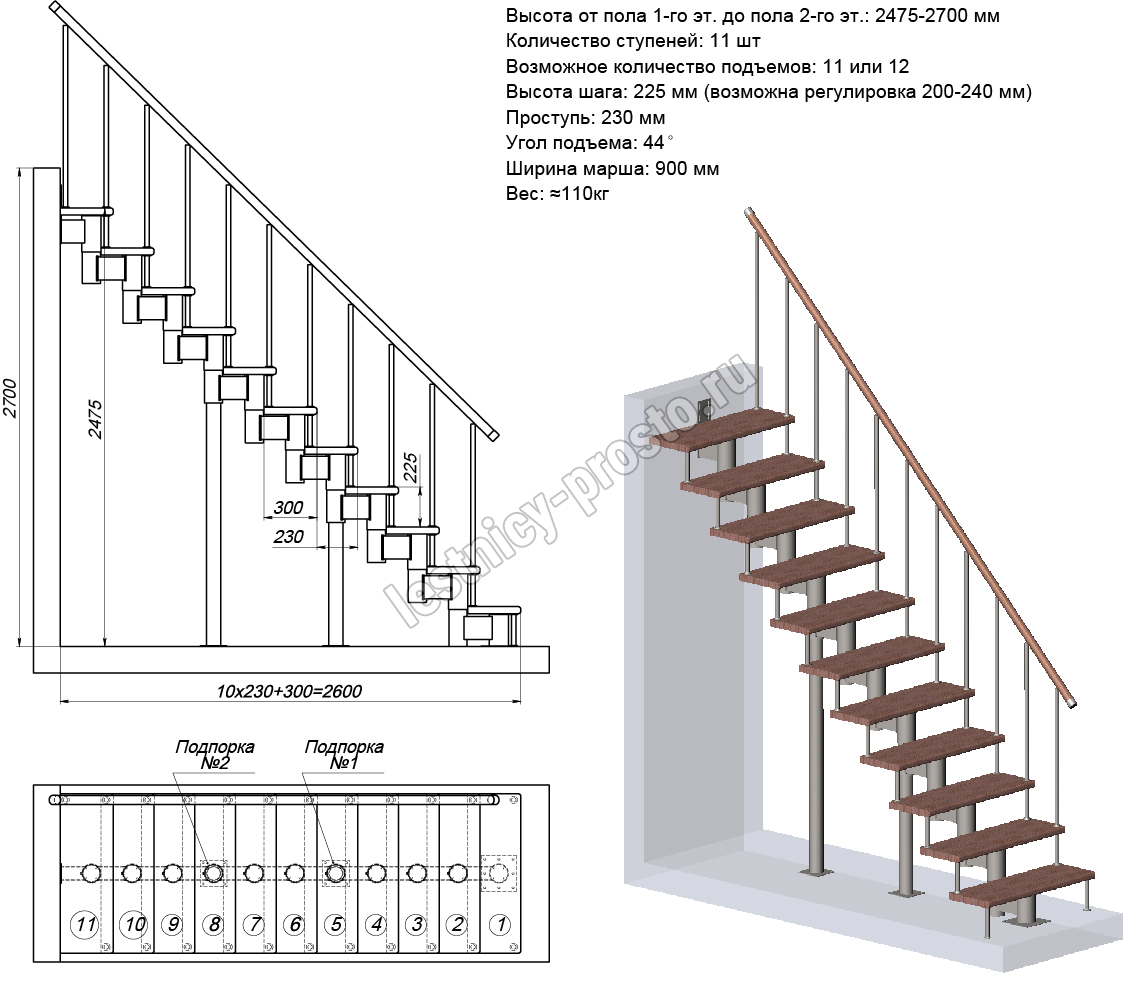 Высота лестницы 2475 - 2700 (11 ступеней) мм