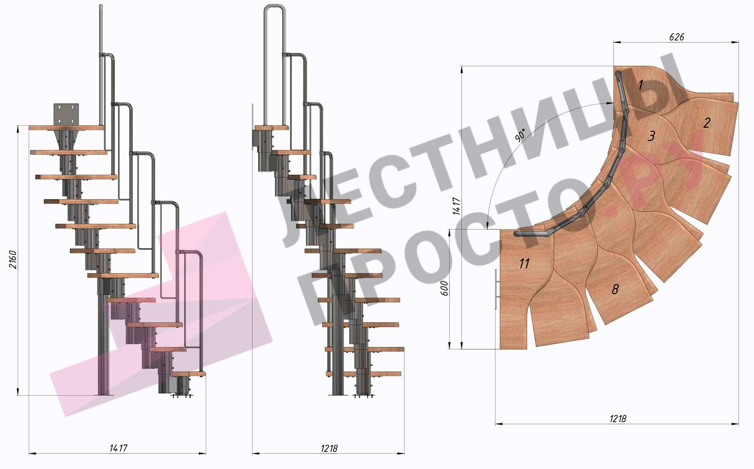 Лестница Prosto Urban Grey г-образная гусиный шаг 600 мм/ Ступени из берёзы мультиплекс