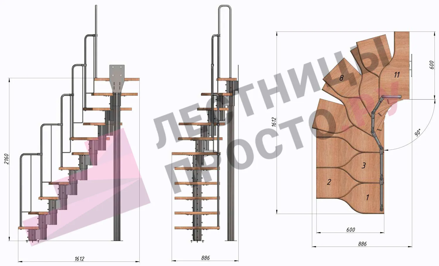 Лестница Prosto Urban Grey г-образная гусиный шаг 600 мм