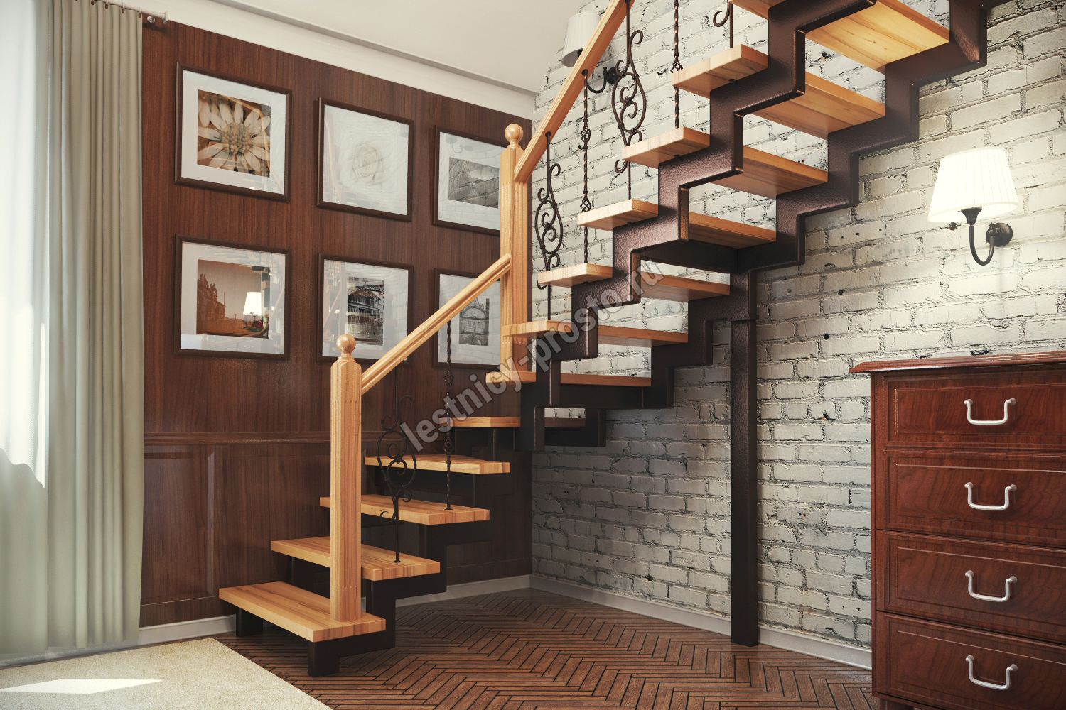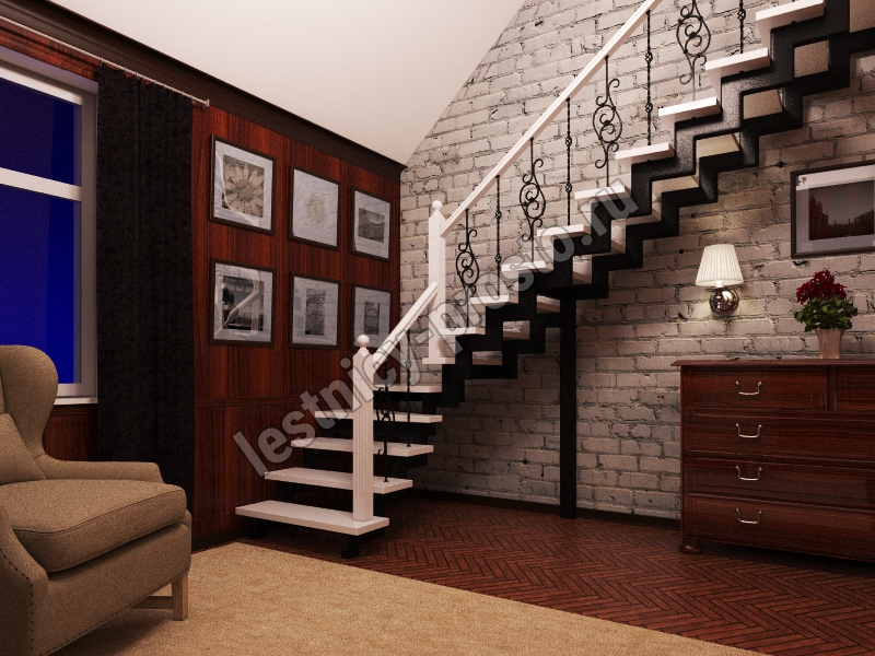 У данного варианта лестницы поворот реализован через забежные ступени. Под заказ возможно изготовление каркаса под поворотную площадку.