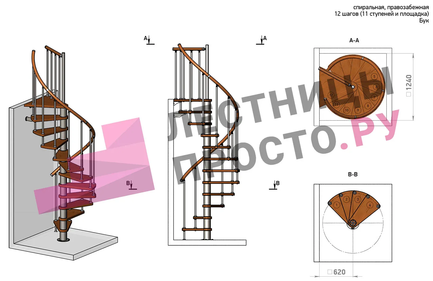 Правая, d=120см, 11 ступеней + площадка