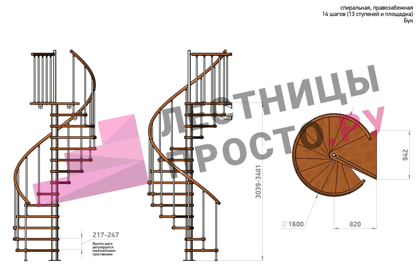 Правая, d=160см, 14 ступеней + площадка