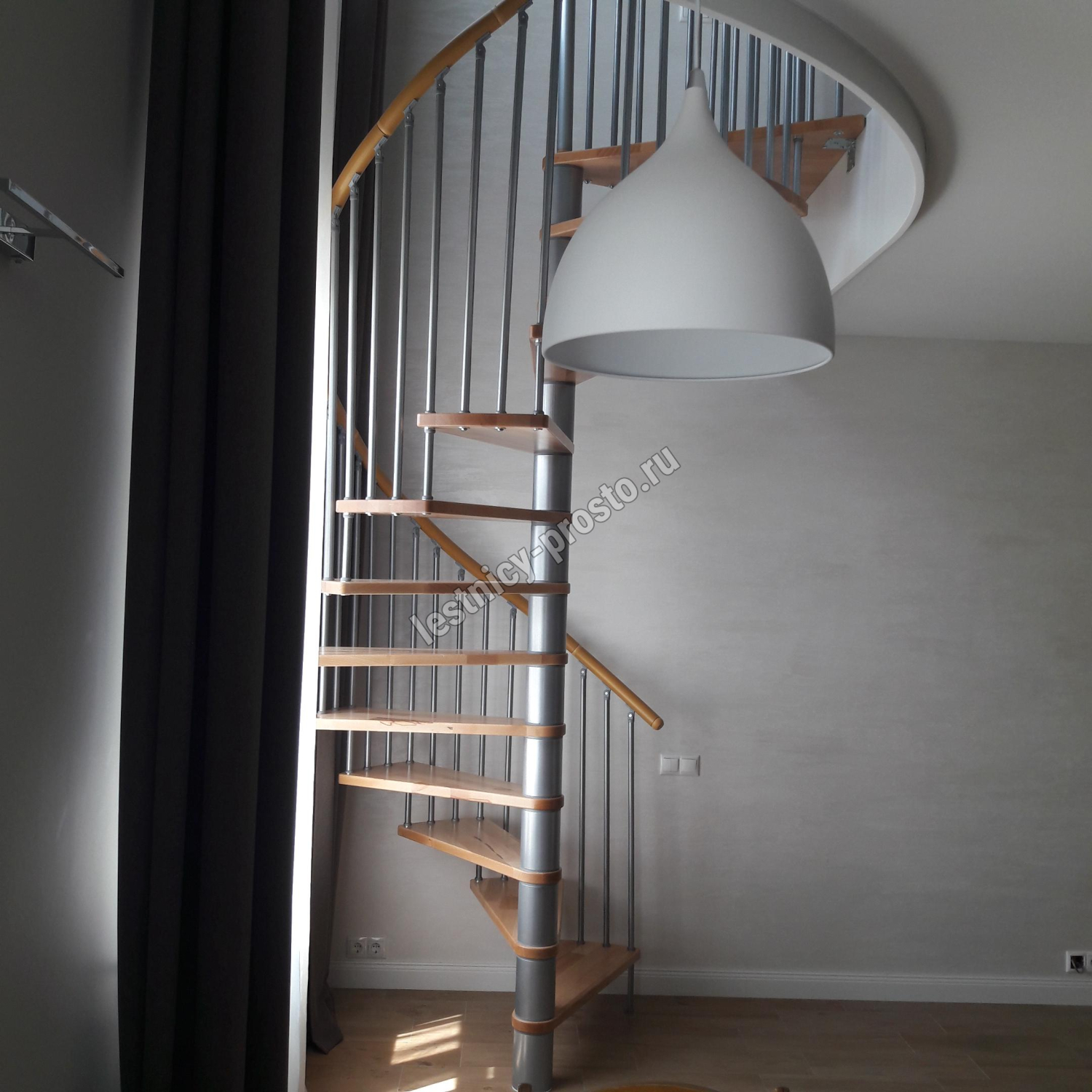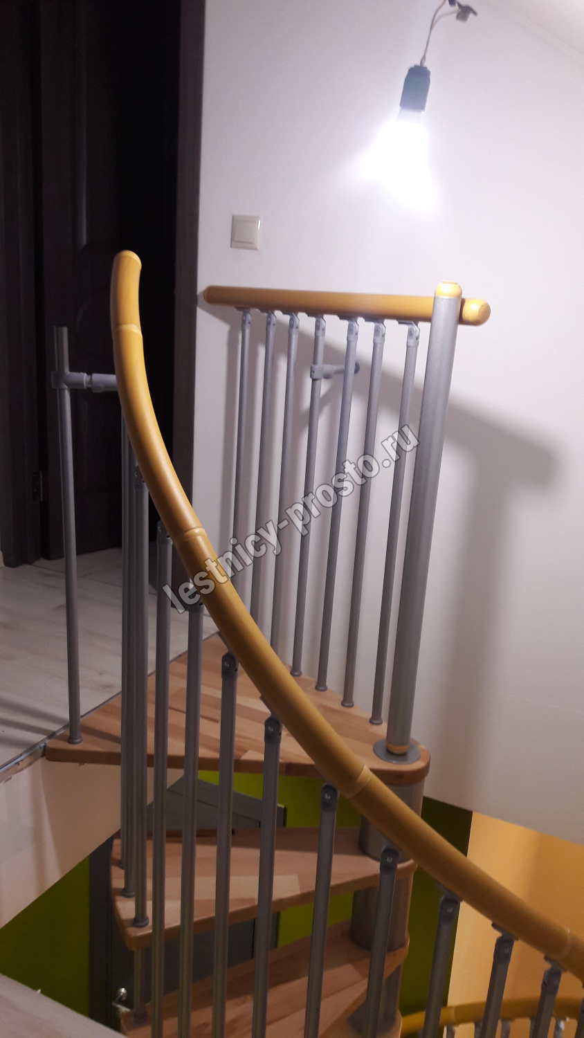 Поручень изготовлен из массива дуба в тон ступеням. Поручень и ступени лестницы покрыты износостойким защитным лаком.
