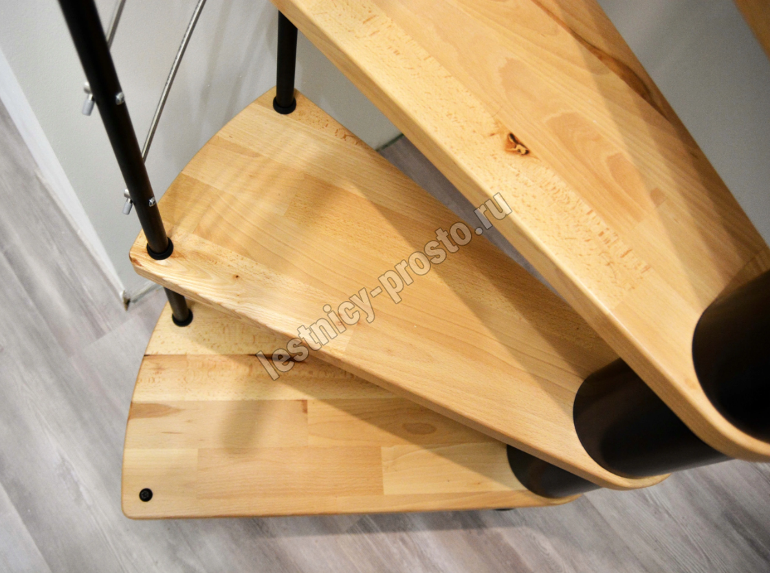 Cтупени и поручень изготовлены из массива дуба и покрыты специальным лаком от компании Минка, который предотвращает царапины, сколы или стирание поверхности при интенсивном использовании лестницы. Благодаря возможности регулировать высоту шага с помощью пластиковых вставок (входят в базовый комплект), высоту лестницы можно варьировать в пределах от 2860 до 3090 мм. Кроме того, купив дополнительную секцию для этой лестницы, можно поднять высоту до 3320 мм.